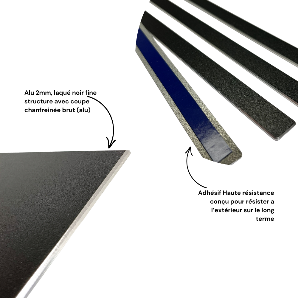 Matériau haut de gamme : Kit déco pour porte en alu laqué noir fine structure de 2mm avec bords chanfreinés alu brut. Matière résistant à la corrosion, antitache et nécessitant peu d’entretien.