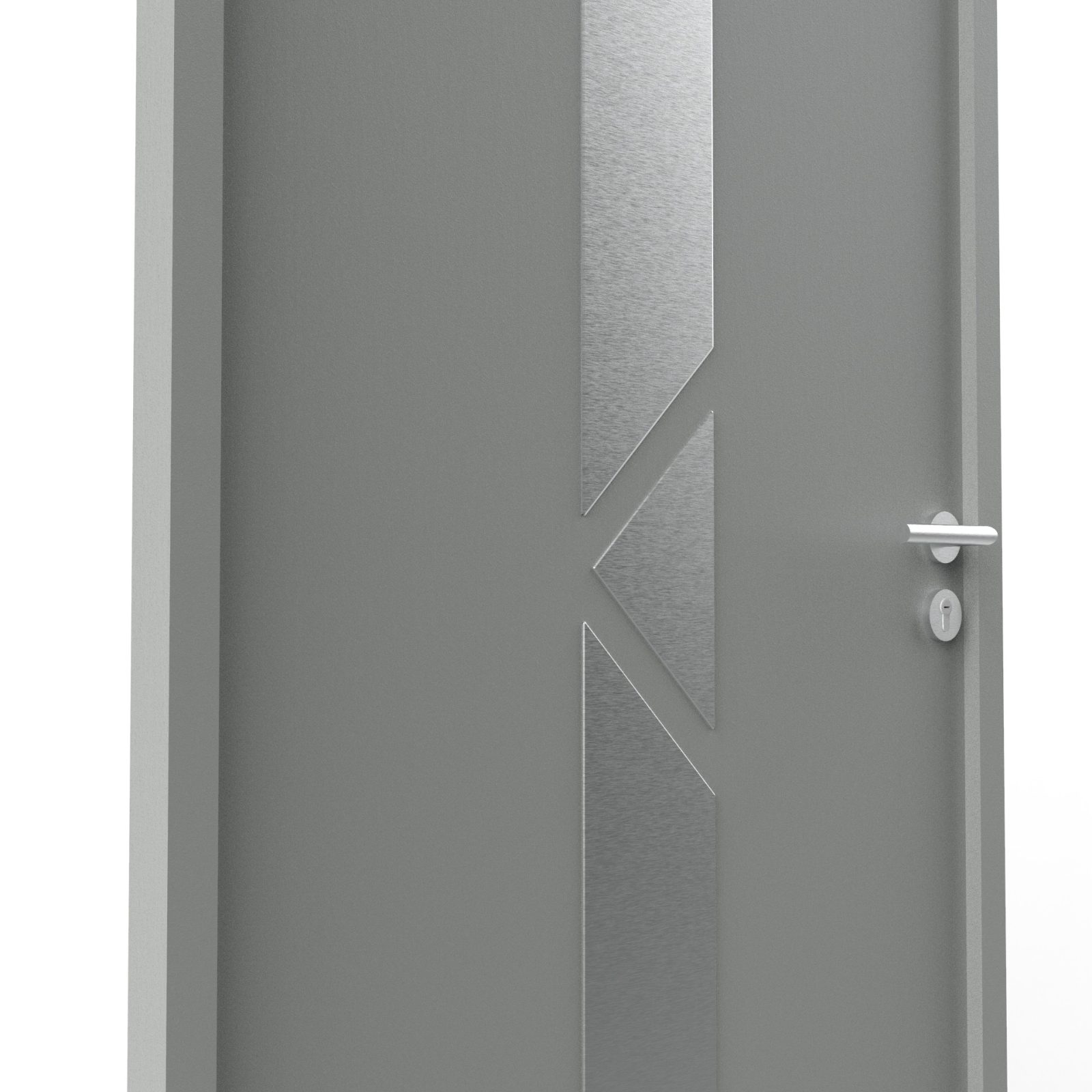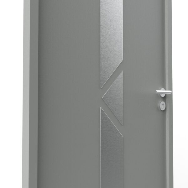 Décor pour porte d'entrée haut de gamme en alu inox brossé, pour porte d’intérieur ou d'extérieur. Applique alu inox de 2.2mm, bords chanfreinés, à coller. Grande résistance de la matière à l’air salin. Les avantages de l'alu avec la finition esthétique de l’inox brossé, sans les inconvénients. Matière résistant à la corrosion, antitache et nécessitant peu d’entretien