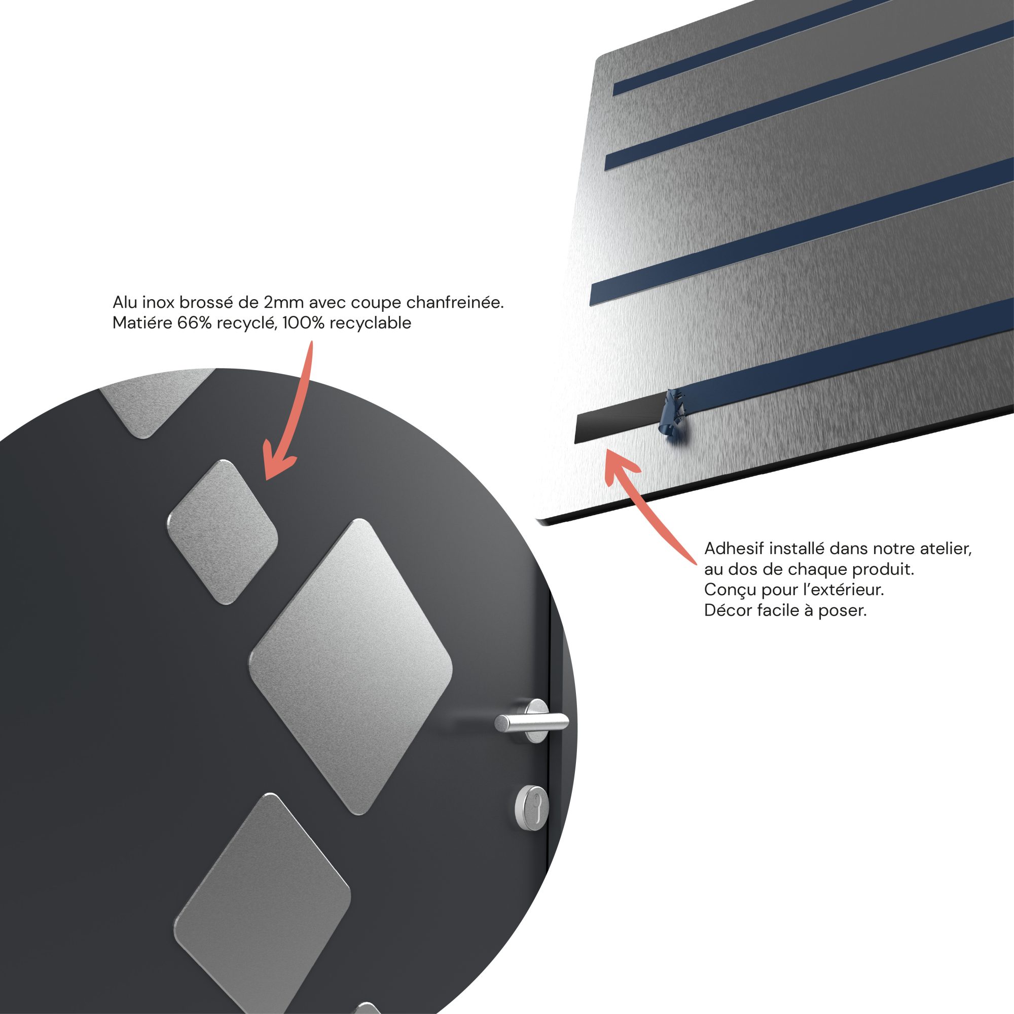Matériau haut de gamme : Décor porte en alu inox brossé 2mm bords chanfreinés. Finition esthétique de l’inox brossé sans les inconvénients. Matière résistant à la corrosion, antitache et nécessitant peu d’entretien, pour un rendu esthétique et durable.